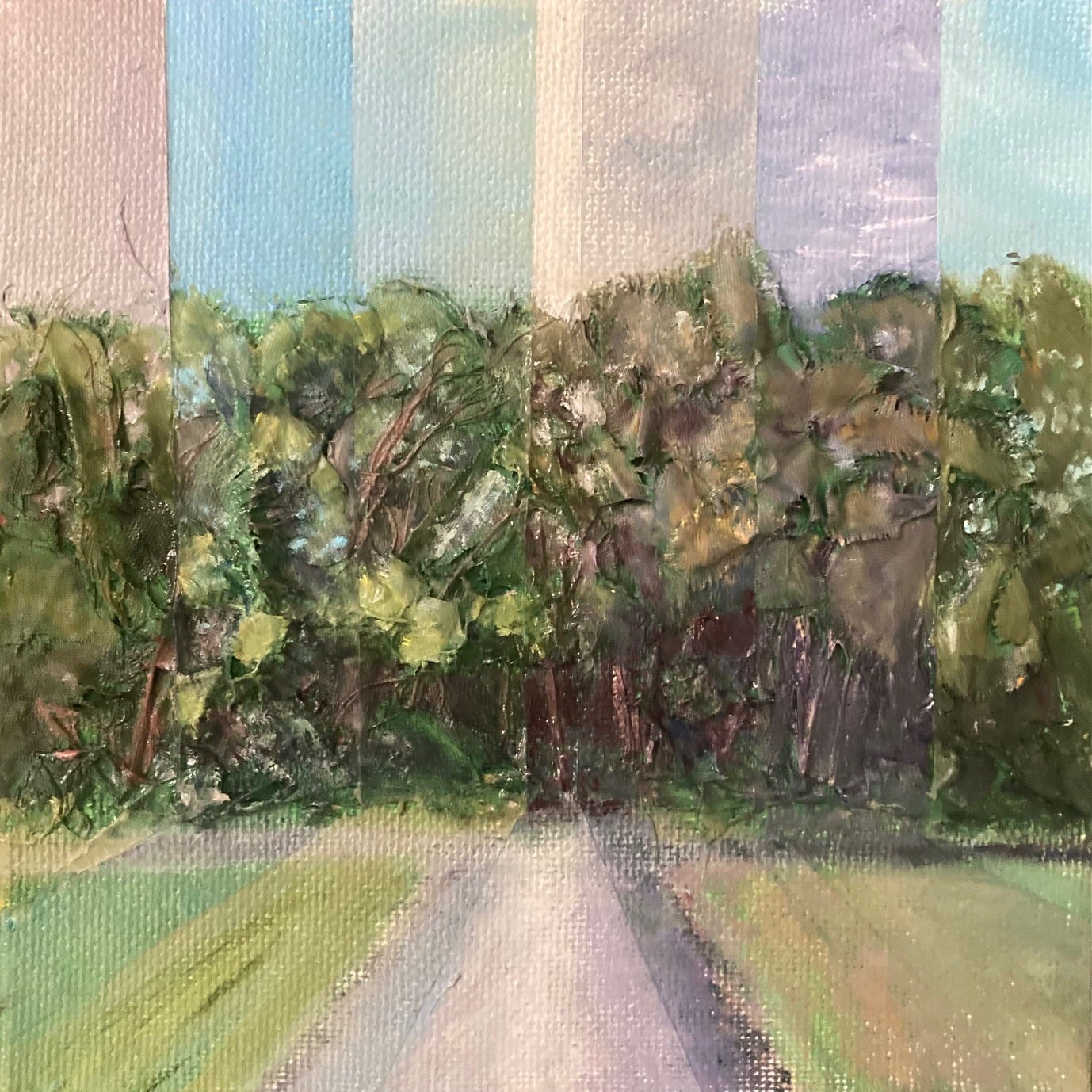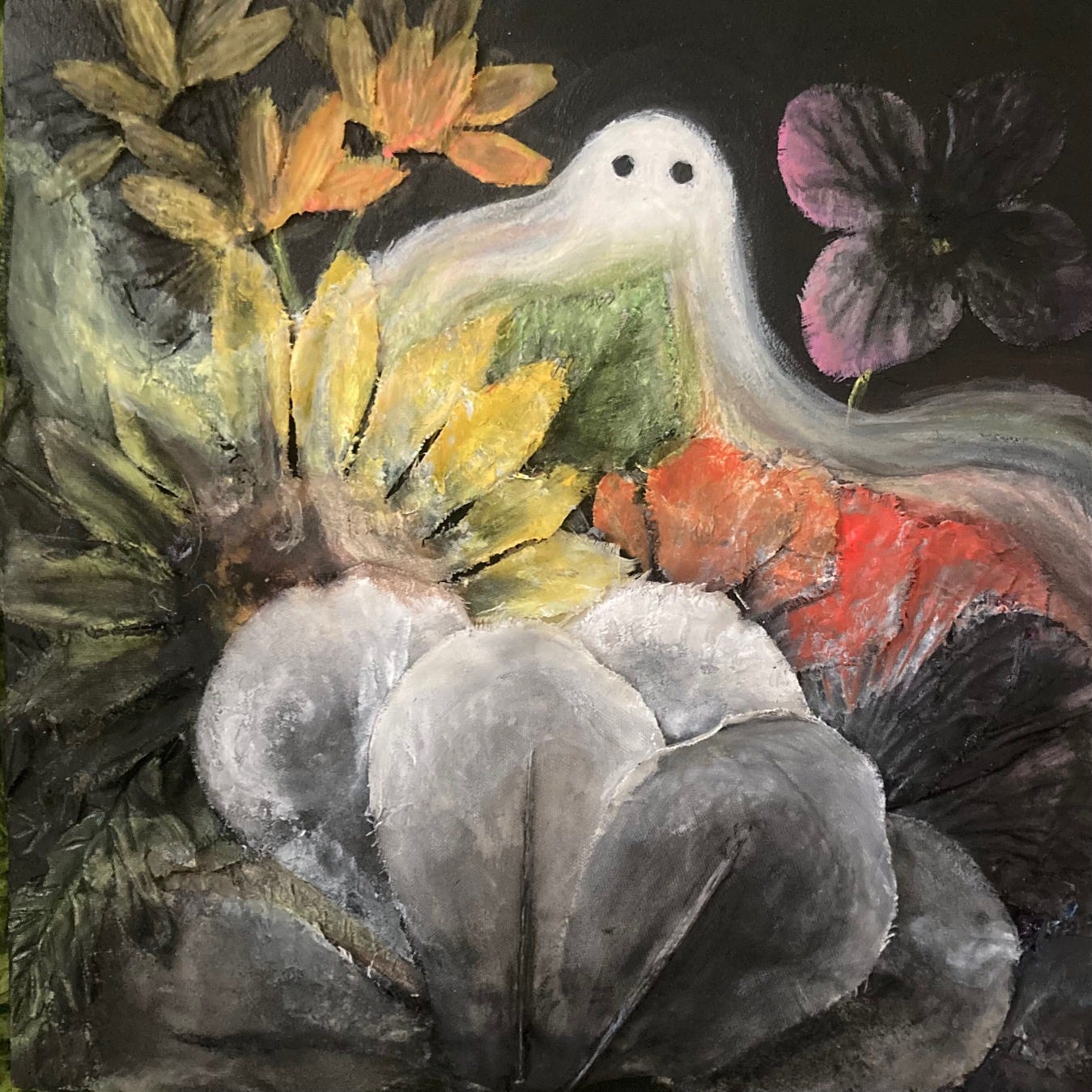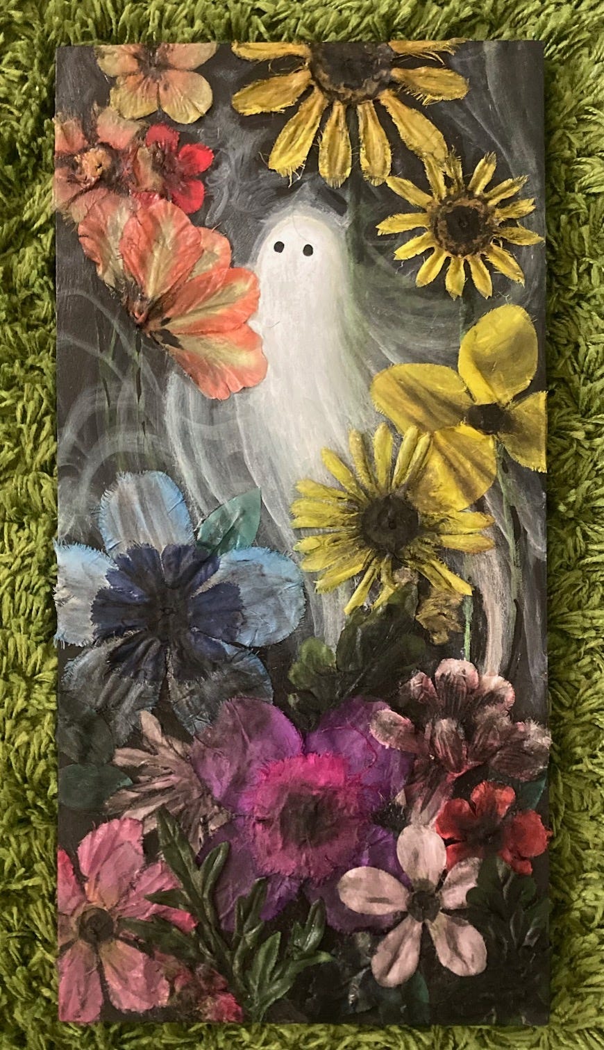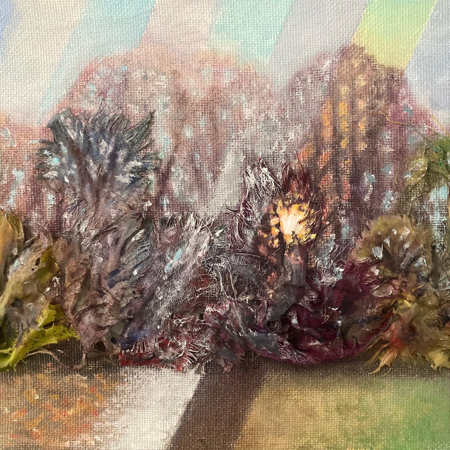 Whenever I work with these old fake flowers, I think about death. I glean them from the ground around cemeteries, where they are doomed to never decay properly; blown about, fading in the sun, getting mowed over and shredded, slowly embedding into the soil. I gather them into a bag and hang it, open, on the backyard clothesline in the hopes that any hitchhiking bugs can escape. Eventually I wash them in a soapy bucket and lay them out to dry on a towel, mindful of the threads of persistent microplastics that could escape into the ground or water, then into the bellies of creatures and on up the food chain, with effects still unknown. When I incorporate them into an acrylic painting - yet another form of plastic - I consider what kind of message is important enough to persist in a similar fashion, long after I’ve gone to my own grave.